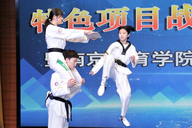 此外,江苏省学生体育协会中小学校工作委员会跆拳道协会发来贺信,主持人当众宣读;播放跆拳道项目宣传片时,三校跆拳道运动员开始布置现场、铺设跆拳道垫,进行现场展示,场下掌声阵阵。